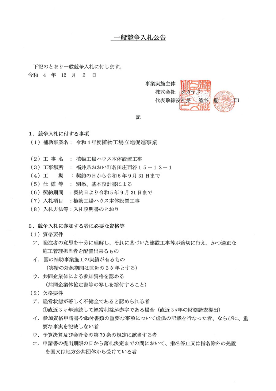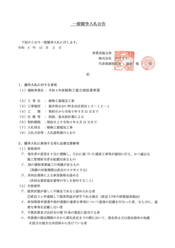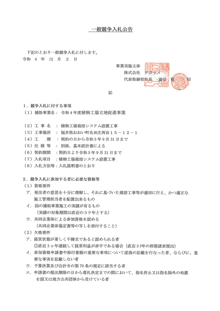 株式会社タガヤスは、持続可能な食料生産システムの構築と地域経済の活性化を目指し、「令和4年度植物工場立地促進事業」の一般競争入札を実施いたします。