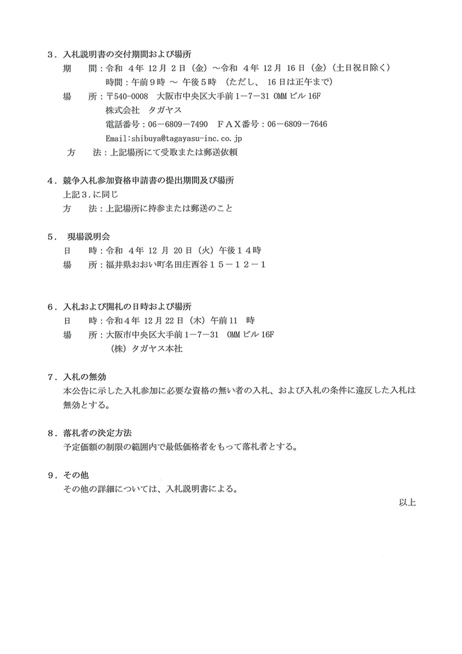 詳細な応募資格、提出書類、審査基準、スケジュールについては、下記入札公告をご確認ください。応募に関するご質問は、弊社までお問い合わせください。